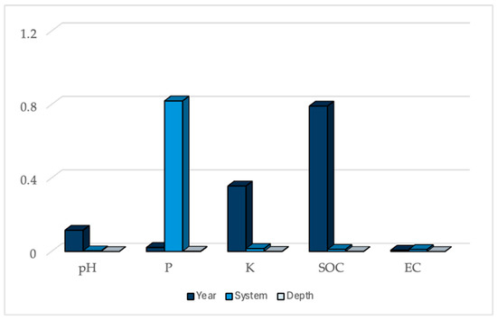 In parallel, the table is supported by Figure 4. This represents the p-values from the ANOVA tests for key soil parameters (pH, P, K, SOC, and EC) grouped by the factors of year, system, and depth. Lower bars (p < 0.05) indicate significant effects, while higher bars (p ≥ 0.05) denote non-significant results