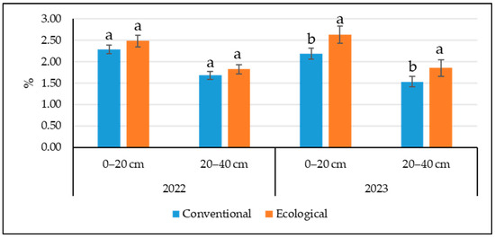Data reveal a more pronounced increase in SOC in the top layer (0–20 cm) of ecological compared to conventional soils, highlighting the positive effects of ecological practices on soil fertility. The observed decline may stem from varying climatic conditions and the impact of management practices, such as inadequate organic matter input or accelerated decomposition due to environmental factors. In the lower layer (20–40 cm), although the differences are smaller, the ecological system showed a steady accumulation of SOC. These results emphasize the need and the importance of optimizing agricultural practices to maintain and enhance organic carbon levels in the long term. By promoting soil sustainability, the organic system presents itself as a viable solution to combat soil degradation and climate change.