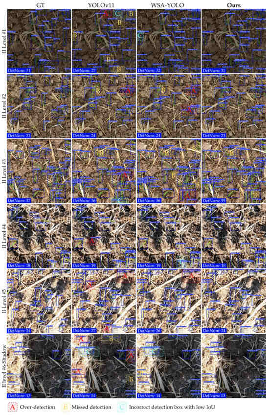 - The DHS-YOLO model is developed to detect wheat seedlings under different illumination intensities, which adopts the YOLOv11 as the basics and consists of a DSC module, HT module, and ShapIoU loss.
