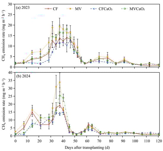 CH4 emission rates affected by different treatments in 2023 (a) and 2024 (b). The error bars denote standard errors. CF and CFCaO2 denote only applying chemical fertilizer without and with CaO2 application, respectively. MV and MVCaO2 denote combining chemical fertilizer application and milk vetch incorporation without and with CaO2 application, respectively.