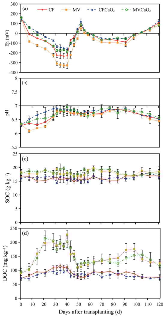 The soil SOC contents exhibited gentle variations (Figure 2c). The SOC contents under the MV and MVCaO2 treatments were generally greater than those under the CF and CFCaO2 treatments. The DOC contents under the MV and MVCaO2 treatments notably increased within the first 40 days and remained higher than those under the CF and CFCaO2 treatments throughout the rice season (Figure 2d). In terms of the mean values of SOC and DOC, MV incorporation was the main influencing factor, while CaO2 did not have a significant effect (Table 2).