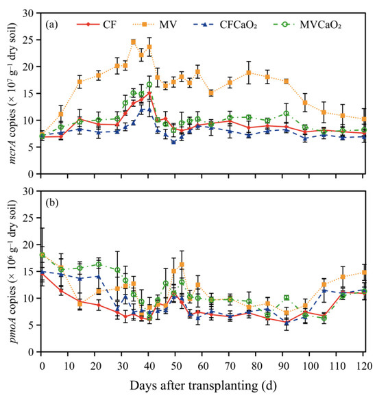 The pmoA gene copies under all the treatments tended to decrease after submergence but increased during midseason drainage (Figure 3b). MV incorporation significantly affected pmoA copies, with the MV and MVCaO2 treatments resulting in higher pmoA copies than the CF and CFCaO2 treatments did (Table 2).