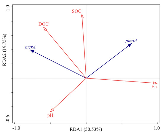 An RDA revealed the environmental drivers of functional gene abundance (Figure 4). DOC and SOC positively affected mcrA copies, whereas Eh had negative effects. SOC and Eh positively affected the pmoA copies, while pH had a negative effect. CH4 emission rates were significantly correlated with mcrA copies, but not with pmoA copies (Figure S3).