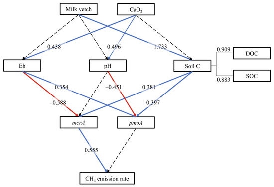 The partial least squares-path model for the impacts of milk vetch incorporation and CaO2 application on CH4 emission rate. Boxes with black borders denote variables. DOC and SOC, two observed variables, were loaded for the latent variable of soil C. Numbers on the arrows indicate the path coefficients. The blue and red arrows denote significant positive and negative effects, respectively (p < 0.05). The dashed arrows denote no significant effects (p > 0.05). The GOF value (indicating the goodness-of-fit of the model) was 0.67.