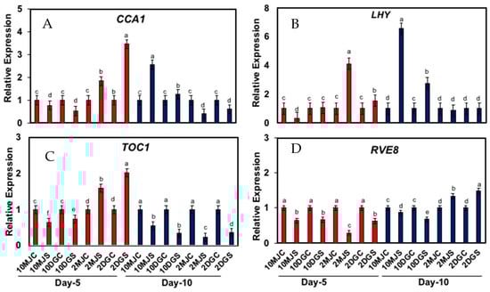 - Rawat, R.; Takahashi, N.; Hsu, P.Y.; Jones, M.A.; Schwartz, J.; Salemi, M.R.; Phinney, B.S.; Harmer, S.L. REVEILLE8 and PSEUDO-REPONSE REGULATOR5 form a negative feedback loop within the Arabidopsis circadian clock. PLoS Genet. 2011, 7, e1001350. [Google Scholar] [CrossRef] [PubMed]