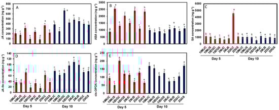- Ilyas, N.; Gull, R.; Mazhar, R.; Saeed, M.; Kanwal, S.; Shabir, S.; Bibi, F. Influence of salicylic acid and jasmonic acid on wheat under drought stress. Commun. Soil Sci. Plant Anal. 2017, 48, 2715–2723. [Google Scholar] [CrossRef]