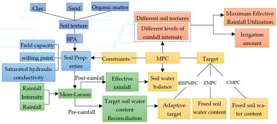 Although there has been significant research progress in existing MPC-based irrigation scheduling, they still have two limitations: (1) Runoff occurs when rainfall intensity (RI) exceeds the soil’s infiltration capacity, while percolation arises if infiltrated water surpasses the soil’s field capacity. This suggests a possible overestimation of rainwater infiltration due to insufficient consideration of RI and soil properties (SP). (2) Existing MPC-based irrigation decisions typically set soil moisture tracking targets as fixed constants, resulting in a possible high level of pre-rainfall soil moisture, which is not conducive to the efficient use of rainwater resources by crops, especially in soil with poor infiltration performance or low water holding capacity.