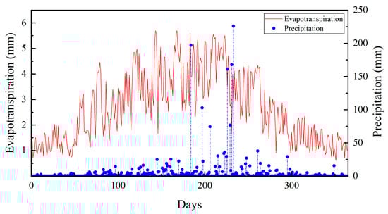 Rainfall and evapotranspiration primarily influence the variation in soil water content over a unit of time during the crop growth cycle [24]. The experiment relied on a simplified soil water balance equation to illustrate the changes in the soil water content [25].