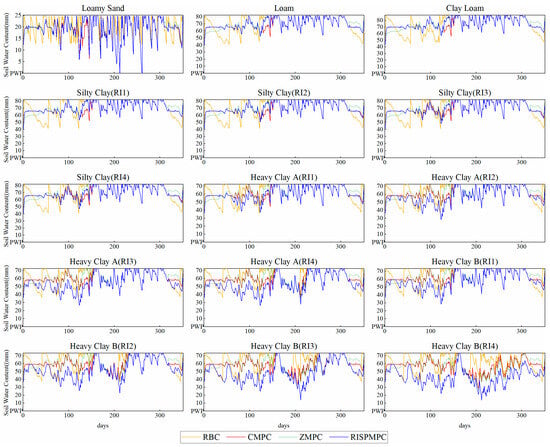 Simulation experiments were conducted for RBC, CMPC, ZMPC, and RISPMPC based on the meteorological data from Ya’an station for the period of 1 January to 16 December 2020, under four different rainfall intensities on six soil textures: loamy sand, loam, clay loam, silty clay, heavy clay A, and heavy clay B. As illustrated in Figure 4, under all RI levels and across different soil textures, these irrigation decisions successfully maintained soil water content above the wilting point. Table 3 exhibits the irrigation volumes for the four irrigation decision methods under different scenarios. It can be observed that RBC’s irrigation volume is consistently higher than that of the other three MPC irrigation decisions on soil textures other than clay loam. The difference in irrigation volumes between MPC-type irrigation decisions and RBC is most pronounced in loamy sand, with MPC methods saving 54–58% of irrigation water compared to RBC.