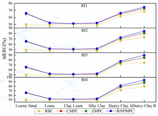 The MERU of the three MPC decisions is almost identical in soils with good infiltration and water retention properties, such as loam, clay loam, and silty clay. As soil infiltration capacity decreases, the MERU of all three methods shows an upward trend, but the increase is more pronounced for RISPMPC. In heavy clay A and heavy clay B, as RI levels increase, the difference in MERU between RISPMPC and the other two MPC decisions also continues to grow.