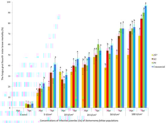 Lycoriella ingenua fourth instar larvae mortality (means ± SE%) caused by five concentrations of infective juveniles (IJ cm−2) of S. feltiae (native K2, P9, ZŠ7 and commercial) three and seven days post inoculation (dpi) at 20 °C (in vitro). Mean values of the larvae mortality for each EPN population separately, three and seven dpi, marked by different letters, are significantly different (t-test, p < 0.05).