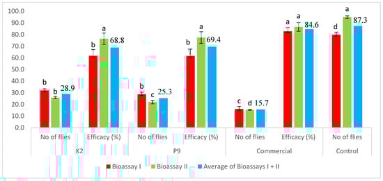 The total number (mean ± SE) of Lycoriella ingenua adults per container for the entire test period in a mushroom growing chamber (in vivo) treated with different Steinernema feltiae populations and pest control efficacy (percentage of control treatment); treatments = P9, K2, and commercial population—150 IJ cm−2; control = water. Mean values marked by different letters differ significantly (Duncan’s post hoc test, p < 0.05).