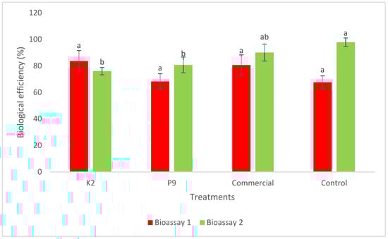 Biological efficiency (BE) of treatments with different Steinernema feltiae populations (P9, K2, and commercial population—150 IJ cm−2) and control (water) on Agaricus bisporus yield (mean ± SE) in bioassays 1 and 2 (in vivo); BE % = ratio of the fresh weight of total mushroom yield and dry spawned substrate weight (462.9 g). Mean values marked by different letters differ significantly (Duncan’s post hoc test, p < 0.05).
