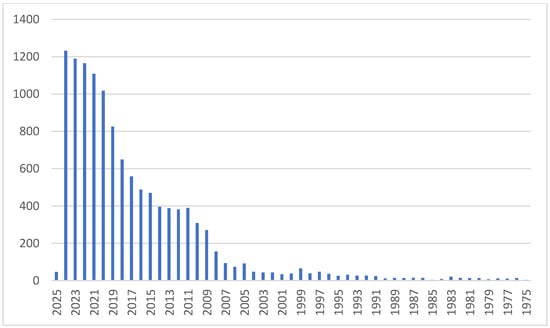 Starting from the 2000s, there was a gradual increase in academic interest in agricultural financing. Although the number of articles published between 2000 and 2010 remained relatively moderate, ranging from 271 (2.255%) in 2009 to 396 (3.295%) in 2014, this period reflects a stabilization of the field, influenced by growing concerns about sustainability, climate change, and the integration of new technologies in agriculture.