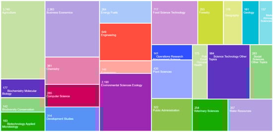The largest percentage of publications (31.117%) is directly associated with the domain of Agriculture, underscoring its fundamental importance in research related to agricultural financing. This includes studies on access to finance, public agricultural policies, subsidy programs, investment strategies, and economic models that support the development of the agricultural sector. Additionally, this domain addresses the impact of climate change on agricultural production and the importance of investments in green technologies and sustainable farming practices. Agricultural financing plays a key role in the transition to more sustainable agriculture and in adapting to environmental challenges.