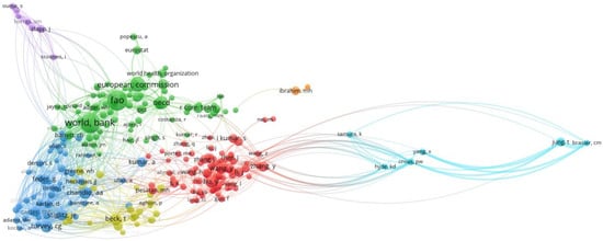 Analyzing the most cited authors in the field of agricultural financing is crucial for identifying researchers and organizations that have made significant contributions to the development of this sector. This type of analysis provides a clear perspective on thought leaders and key research directions that have shaped the field. It also highlights research trends, priority topics, and theoretical models that have had a significant impact on the literature and public policies. By applying a citation threshold of 50, to analyze the most cited authors out of a total of 258,891 authors with publications in this field, we obtained a significantly smaller number of authors—only 248, as shown in Figure 4. It is important to note that the threshold of 50 citations was applied to highlight only those authors with a significant and recognized impact in the field, considering the large total number of authors. This method allows us to focus on those who have contributed essential and representative works, which have had a continuous influence on the evolution of research and scientific literature, rather than those with less visible activity or a smaller number of citations.