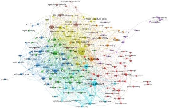 The analysis of the most commonly used keywords in the field of agricultural finance is essential for understanding the trends and evolution of research in this area. By identifying keywords, one can observe the key aspects of agricultural finance, such as funding sources, sustainability, green technologies, and relevant public policies. Moreover, this analysis can help identify research gaps, future study directions, and the impact of political decisions on the agricultural sector. It can also assist decision-makers in better understanding how to allocate financial resources to support the development of a sustainable and efficient agriculture. The pattern of keyword occurrences across various studies can help identify key research directions for future investigations [59]. A co-occurrence network of keywords is created using the VOSviewer visualization tool, producing a dimensional map [61]. With VOSviewer, it is possible to generate a keyword map based on both automatically selected keywords, determined by their frequency in the text, and keywords suggested by the author [61,62,63,64,65,66,67].