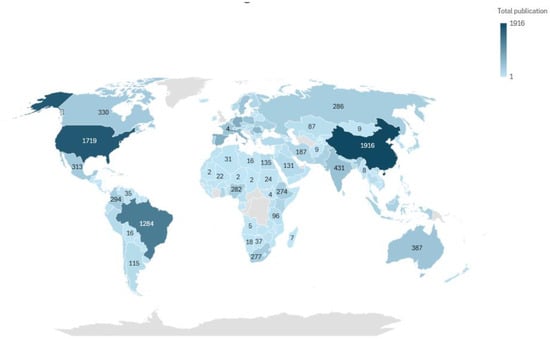 Another relevant aspect is the continuity of research in the period 2020–2024, when the annual number of publications consistently exceeded 1000 papers. For example, in 2023, 1190 articles (9.901%) were published, and in 2022, 1165 articles (9.693%), thus consolidating the strategic relevance of this field. This intensification of research highlights the urgent need to find sustainable solutions to global agricultural challenges.