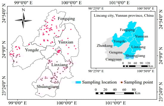 Lincang features a temperate climate with an annual mean value of 17.5 °C and 1400 mm precipitation. Surface soils (0–30 cm) (n = 190) in tea plantations were sampled in five regions from Lincang, southwest China, including Fengqing (n = 78), Linxiang (n = 52), Yongde (n = 30), Shuangjiang (n = 20) and Yunxian (n = 10) (Figure 1). Each soil sample was made up of six well-mixed subsamples, air-dried, ground and sieved (0.15 mm). The sample size of each region was set using the stratified random sampling method, which was determined according to tea plantation area and altitude across the five regions of Lincang. The spatial randomness of sampling points was assessed using ArcGIS 10.8 to confirm inter-sample independence and mitigate potential bias caused by spatial clustering.