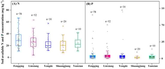 Soil-available N (A) and P (B) concentrations in 190 tea plantation soils from five regions, including Fengqing (n = 78), Linxiang (n = 52), Yongde (n = 30), Shuangjiang (n = 20) and Yunxian (n = 10) in Lincang, southwest China. The solid line and square inside the box represent the median and mean value, respectively.