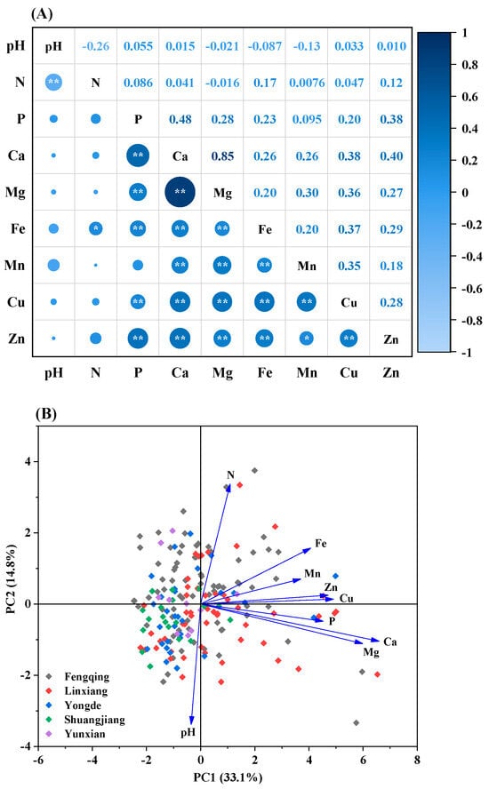 Pearson correlations (A) and principal component analysis (PCA) (B) among soil pH and available N, P and metallic element concentrations with significance at p < 0.05 (*) and p < 0.01 (**).