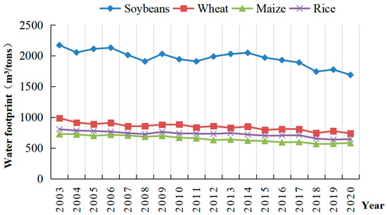 The water footprint of food production in China from 2003 to 2020 is shown in Table 3. Overall, the water footprint of soybean production in China is the highest, with a national average of 2044.595 cubic meters per ton. The water footprint of maize production is 655.713 cubic meters per ton, about one third that of soybeans. The water footprints of wheat and rice are in the middle, with national averages of 888.94 cubic meters per ton and 741.047 cubic meters per ton, respectively. In terms of regional differences in the water footprint of soybean production, the water footprint of soybean production in the south and southwest regions is at a high level. The Yangtze River’s middle and lower reaches, along with the northeast region, exhibit a moderate level. Regarding regional variations in the water footprint for the production of wheat, maize, and rice, both the South China and the southwest regions show a high level. The northeast and northwest regions are at a lower level. These regional disparities are primarily influenced by factors such as crop coefficients and precipitation during the crops’ growing period.