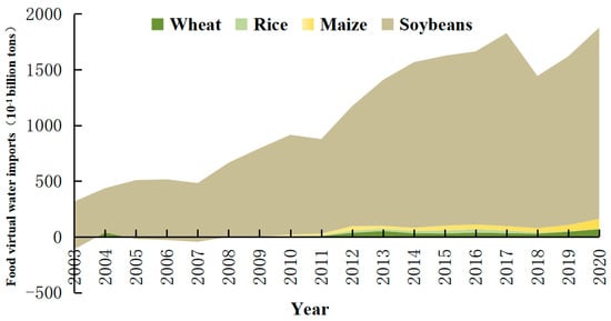 First, the scale of virtual water in net wheat imports experienced a trend of first rapidly increasing, then decreasing, and finally slowly increasing. Affected by the large-scale reduction in wheat production in 2003, the virtual water volume of net wheat imports first increased from −1.5877 Bt in 2003 to 5.0204 Bt in 2004, then decreased to −1.9127 Bt in 2007, and finally slowly increased to 6.9249 Bt in 2020. From 2003 to 2020, the total virtual water of net wheat imports increased by 8.5126 Bt. Second, the scale of virtual water for net rice imports shows a trend of rapid increase followed by a slow decrease, gradually increasing from −1.972 Bt in 2003 to 2.0027 Bt in 2012 and then decreasing to 0.2175 Bt in 2020. Third, compared to wheat and rice, the net virtual water imports of maize increased rapidly from −7.6396 Bt in 2003 to 16.5303 Bt in 2020, an increase of 16.5303 Bt in total net virtual water imports. Fourth, soybeans have always been the food product with the largest net virtual water import in China and have grown rapidly from 42.9079 Bt in 2003 to 172.3149 Bt in 2020, an increase of 300.20%.