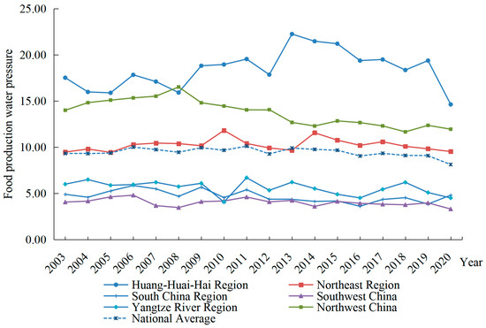 The specific situation of the average water pressure in food production in each region from 2003 to 2020 is shown in Figure 5. Overall, it shows a trend of first increasing and then decreasing but there are significant differences between regions. The Huang-huai-hai region, northwest, and northeast regions show significantly higher levels of water pressure in food production. Among them, Northeastern China and the Huang-huai-hai region account for 44.26% of the country’s cultivated land area and 54.76% of the food sown area with a high demand for water in food production. However, the total water resources in these two regions account for only 9.23% of the national total, i.e., they have low water resources endowment. The mismatch between food production and water resources has led to a long-term high level in the water pressure index in food production in these two regions. In contrast, the pressure on water in food production in South China, Middle and Lower Yangtze, and the southwest regions is significantly lower. Among them, the water pressure index of food production in South China and Southwestern China has long been at a low level due to their high water resource endowment and the fact that the food sown area only accounts for 21.48%, which is at a long-term low level nationwide, resulting in low water demand in food production.