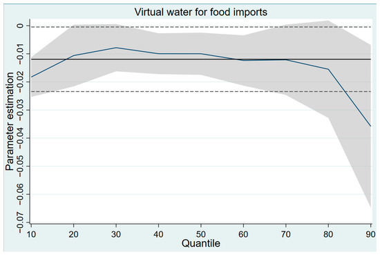 Plot of quantile regression coefficients of water resource substitution affecting water pressure in food production. Notes: (1) The blue curve in the figure represents the parameter estimates for the virtual water in food imports across various quantiles, derived through quantile regression. (2) The shaded region highlights the 95% confidence interval for these parameter estimates.