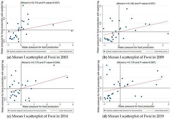 To facilitate observation, this study plotted a scatter plot of the spatial distribution of water pressure in food production in 2003, 2009, 2014, and 2019 (Figure 7). From the figure, we can observe that in the sample period, most of the spatially weighted water pressure values in food production in the provinces are located in the first and third quadrants. The results of the fitting analysis also extend across the first and third quadrants, indicating a strong positive global spatial correlation. This suggests the presence of a significant spatial clustering effect regarding water pressure in food production among the 30 provincial-level administrative regions in China from 2003 to 2020. Specifically, provinces with higher water pressure in food production are clustered and provinces with lower water pressure in food production are adjacent to each other, similar to the findings of Deng et al. [9]. This study suggests that incorporating spatial econometric models into the analysis is essential in order to account for spatial effects. This approach would help mitigate measurement bias in models that overlook the influence of geospatial distribution factors.