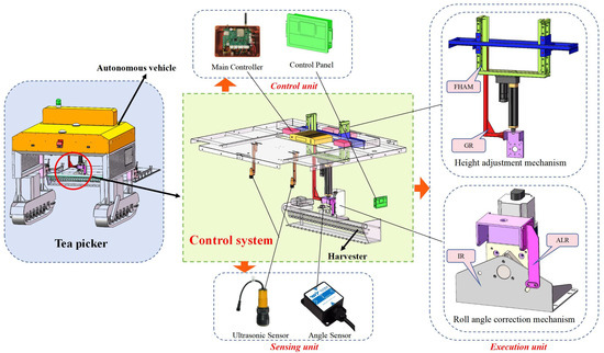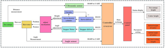 This control system encompasses several core components, including a controller responsible for overall operation management, a height adjustment mechanism dedicated to precisely adapting to the vertical variations of the tea canopy, a roll angle correction mechanism aimed at maintaining the optimal orientation of the harvester, an ultrasonic sensor and angle sensor proficient in sensing relevant environmental parameters, and a control panel facilitating user–system interaction.