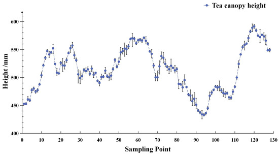 where t symbolizes the current operational instant, while represents the detected distance corresponding to the time. The value of , following recursive average filtering, is adopted as the effective detection distance for the height at the specific point of the tea canopy. Thereby, the obtained tea canopy height functions as the reference line for the harvester to track, as depicted in Figure 4. Through numerous experimental trials, it was conclusively verified that the error associated with the measurement of the tea canopy height was effectively confined within 3%. As a result, the findings derived from these tests can be considered a dependable foundation for the precise control of the harvesting height tracking process.