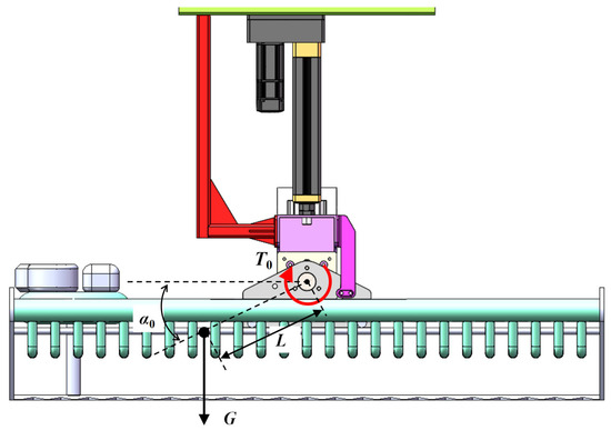 As illustrated in Figure 6, the center of the rotating shaft is positioned 250 mm directly above the cutter surface of the harvester. Owing to the structural characteristics of the harvester, the gravitational force G exerts a certain moment M on the rotating shaft. Consequently, the reduction motor is required to proactively supply a reverse torque T to ensure the horizontal alignment of the cutter surface. Under the condition that the roll angle of the vehicle body is zero and the cutter surface is level, the generated torque equation is established as follows: