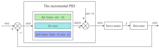 As can be inferred from the aforementioned equation, the influencing factor of the time interval ∆t hinges upon the roll angle θ and the average angular velocity ω of the geared-down motor. Meanwhile, the displacement S of the vehicle is dictated by the travel speed v and time ∆t. Consequently, ω emerges as a pivotal determinant for the system’s real-time responsiveness. The ultimate aim is to effectuate the adjustment of the harvester’s angle within an infinitesimally short vehicle body displacement. In this study, the incremental PID control [35] algorithm is adopted for the roll angle correction control of the harvester. It forms a deviation e(n) = r(n) − y(n) based on the given ideal roll angle value r(n) = 0 of the harvester and the actual roll angle value y(n) of the harvester. u(n) is the control signal for the torque of the reduction motor in the roll correction system. Figure 7 illustrates the structure diagram of the harvester roll angle controlled by PID.