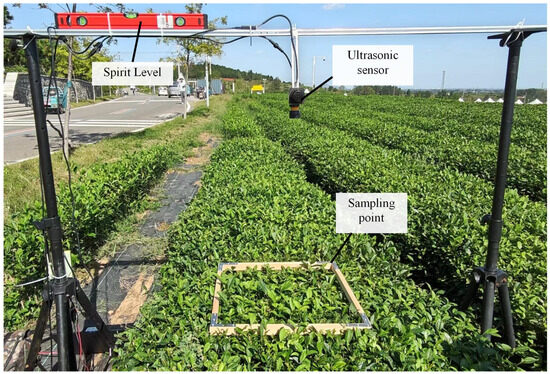 To guarantee the detection precision of the ultrasonic sensors, the discrepancies between the measured values and the actual values of the ultrasonic sensors were determined. An experimental platform, as illustrated in Figure 8, was erected in the tea plantation for calibrating the measurement errors of the ultrasonic sensors. This platform enabled the free adjustment of the distance between the detection plane of the ultrasonic sensor and the tea canopy layer. Moreover, a spirit level was employed to ensure that the detection direction of the ultrasonic sensor was precisely aligned with the tea canopy layer.