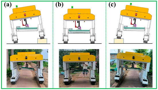 Schematic diagram of the stability test for the roll angle correction of the harvester. (a) represents that the left side of the vehicle body is higher; (b) represents that the vehicle body is horizontal, and (c) represents that the right side of the vehicle body is higher.