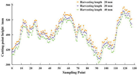 After performing coordinate transformation on the extracted data of the telescopic distance of the servo electric cylinder, we obtained the absolute height of the operation trajectories for different harvesting lengths, as shown in Figure 11. It can be directly observed from the figure that, under different harvesting lengths, the changing trends of the operation trajectories are highly similar. Although there are differences in the height of each trajectory, this indicates that the height tracking of the operation trajectories is stable for different harvesting lengths.