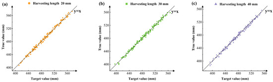 Figure 12 shows the height tracking accuracy of cutting for different harvesting lengths. It can be visually observed from the figure that the actual values for the three harvesting lengths of 20 mm, 30 mm, and 40 mm are all concentrated near the straight line y = x. In order to verify whether the cutting heights under different harvesting lengths had statistical significance, an analysis of variance was conducted. The results showed that there were significant differences in cutting heights under different harvesting lengths (p = 0.0001 < 0.05). Further calculations showed that the Pearson correlation coefficients (PCC) between the actual and target height trajectories under the three harvesting lengths were 0.9914, 0.9958, and 0.9959, respectively. The root mean square errors (RMSE) were 3.45 mm, 3.59 mm, and 3.62 mm, and the mean absolute errors (MAE) were 3.17 mm, 3.01 mm, and 2.97 mm. The height tracking error under the three harvesting lengths was mainly concentrated within the range of ±5 mm. The relevant parameters are shown in Table 4. This indicated that the height-tracking performance under the three different harvesting lengths was good, with a small average error and error fluctuation, meeting the design requirements.