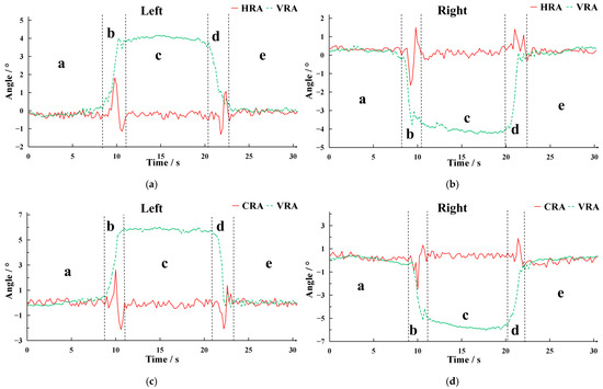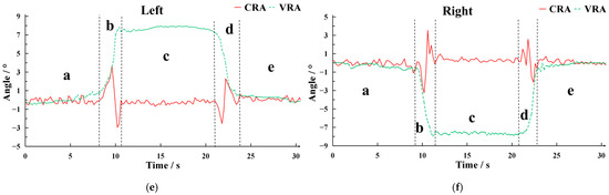 The distribution of the harvester roll angle (HRA) and vehicle roll angle (VRA) when the vehicle body tilts left and right under different height differences of ridged fields. In the figure, the annotations a, b, c, d, and e correspond to the quintessential phases of the vehicle’s traversal: the before going uphill (a), going uphill (b), at the top of the hill (c), going downhill (d), and after going downhill (e), respectively. The widths of the black dashed lines on both sides of b and d represent the time required for the harvester angle correction during uphill and downhill, respectively. (a) H = 10 cm (Left side high); (b) H = 10 cm (Right side high); (c) H = 15 cm (Left side high); (d) H = 15 cm (Right side high); (e) H = 20 cm (Left side high); (f) H = 20 cm (Right side high).