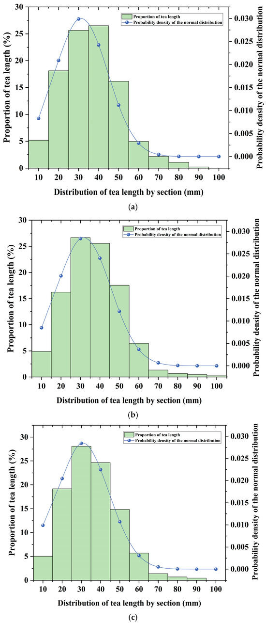 As depicted in Figure 14, the distribution of the harvesting length in each sampling segment evidently exhibited a normal distribution tendency. Specifically, the length distributions of tea harvested by the experimental prototype in each sampling segment were highly consistent. The mode of each segment’s height was concentrated around 30 mm, aligning with the set value, and the harvested lengths demonstrated a high concentration near the target setting. Overall, no significant differences were observed in the harvested data across sampling segments, indicating stable harvesting quality of the system. Real tea images during the harvesting trial are presented in Figure 15. Figure 15a displays all the collected tea samples. (note that autumn tea is larger in size due to seasonal growth characteristics); Figure 15b shows the intact tea after screening; and Figure 15c illustrates the statistics of the harvesting lengths of the tea samples.