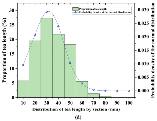 The length distribution of harvested tea. (a–c) are under the condition of uniform height of paths between tea ridges, and (d) is under the condition of height differences in paths between tea ridges.