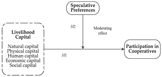 Speculative preference refers to natural rubber farmers’ tendency to prioritize short-term gains over long-term investment returns [25]. This preference may arise from farmers’ sensitivity to price fluctuations or an uncertain outlook on market trends, as opposed to securing long-term guarantees through sustained participation in cooperatives. When natural rubber farmers exhibit higher levels of speculative preference, they may be drawn to short-term profit opportunities, which can weaken the influence of livelihood capital on their decision to join cooperatives. Cooperatives generally advocate for shared cooperation and long-term development [3]. At the same time, individuals with speculative tendencies prioritize immediate, personal financial returns [27], which makes it difficult for them to align with the long-term goals of cooperatives. This is especially true in the context of frequent rubber price volatility [32], where speculative preferences are more likely to drive short-term behaviors, leading farmers to opt out of cooperative participation. In contrast, natural rubber farmers with lower speculative preferences tend to prioritize stable and enduring economic benefits over short-term speculative activities [33]. They are more likely to invest their livelihood capital in cooperative activities that may take longer to yield results [7]. Based on this, the following hypothesis is proposed (see Figure 1):