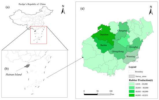 Study area. (a) is a map of the People’s Republic of China, (b) shows the location of Hainan Island, and (c) is the area we surveyed.