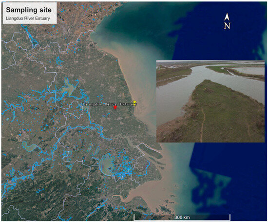 Firstly, 6 kg soil samples were collected from a depth of 10–30 cm in the Spartina alterniflora zone at the Liangduo River Estuary, Yancheng City, Jiangsu Province, China (32°52′38.309″ N, 120°55′6.869″ E) (Figure 1). Based on the WRB 2022 classification, the soil in the Liangduo River Estuary is classified as Acrisols (AC), characterized by low-activity clays and a low base status [20]. After air-drying, the soil was sieved through a screen with a diameter of 150 μm to remove the botanic residues, rocks, and other impurities, resulting in uniform original samples with consistent physical properties. The basic physicochemical properties of the soil are set out in Table 1. Since HDPE is the main type of MPs in areas of human activity [21], HDPE powder (particle size 6.5 μm) produced by Dongguan Jingke Polymer Co., Ltd. (Dongguan, China) was chosen as the experimental MP for this study.