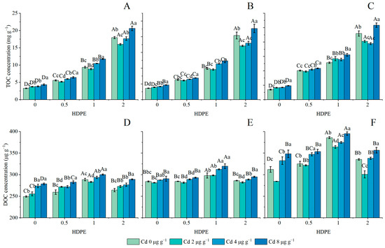 TOC concentration in samples (mg g−1) (A): 14 days; (B): 28 days; (C): 56 days. DOC concentration in samples (μg g−1) (D): 14 days; (E): 28 days; (F): 56 days. Error bars represent mean ± standard deviation (n = 3). Different capital letters indicate differences in different HDPEs are significant (p < 0.05), and different lowercase letters indicate differences in different Cd are significant (p < 0.05).