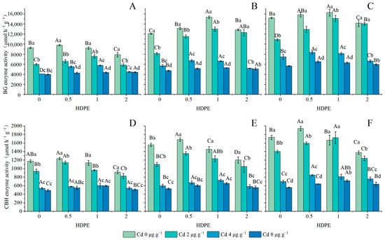 BG enzymatic activity in samples (μmol h−1 g−1) (A): 14 days; (B): 28 days; (C): 56 days. CBH enzymatic activity in samples (μmol h−1 g−1) (D): 14 days; (E): 28 days; (F): 56 days. Error bars represent the mean ± standard deviation (n = 3). Different capital letters indicate differences in different HDPE are significant (p < 0.05), and different lowercase letters indicate differences in different Cd are significant (p < 0.05).