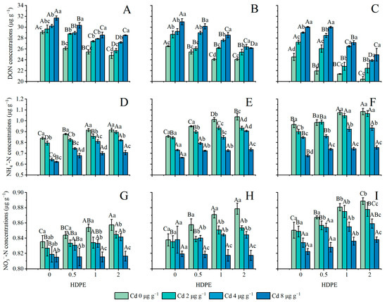 DON concentration in samples (μg g−1) (A): 14 days; (B): 28 days; (C): 56 days. NH4+-N concentration in samples (μg g−1) (D): 14 days; (E): 28 days; (F): 56 days. NO3−-N concentration in samples (μg g−1) (G): 14 days; (H): 28 days; (I): 56 days. Error bars represent the mean ± standard deviation (n = 3). Different capital letters indicate differences in different HDPEs are significant (p < 0.05), and different lowercase letters indicate differences in different Cd are significant (p < 0.05).