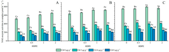 NAG enzymic activities in samples (μmol h−1 g−1) (A): 14 days; (B): 28 days; (C): 56 days. Error bar represent the mean ± standard deviation (n = 3). Different capital letters indicate differences in different HDPEs are significant (p < 0.05), and different lowercase letters indicate differences in different Cd are significant (p < 0.05).