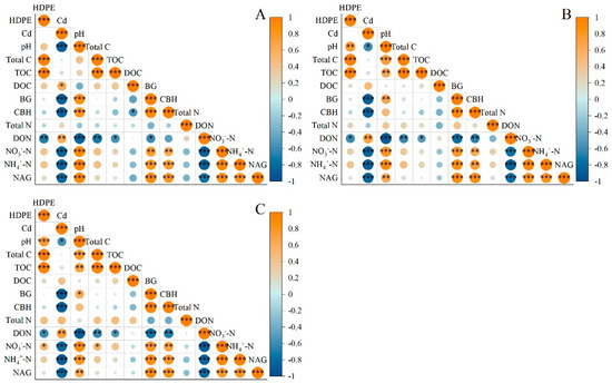 As shown in Figure 6, there was a positive correlation between pH and HDPE in Spartina alterniflora soil samples, and it became more and more significant with the increase in the incubation period. The correlation between pH and HDPE was not significant when the incubation time was 14 days, but p ≤ 0.01 and p ≤ 0.001 were detected when the incubation time was 28 days and 56 days, respectively. There was no significant correlation between DOC, BG, CBH, TN, NH4+-N, NO3−-N, and NAG and HDPE, while there was a significant negative correlation between DON and HDPE (p ≤ 0.01), which was consistent under the three incubation times. There was a negative correlation between pH and Cd, which decreased with the incubation time: p ≤ 0.001 under 14-day incubation, and p ≤ 0.05 under 28-day and 56-day incubation. There was a positive correlation between Cd and DOC concentration, but it was significant only under 14-day incubation, at p ≤ 0.05. Under the three incubation conditions, Cd had a significant negative correlation with BG, CBH, NH4+-N, NO3−-N, and NAG (p ≤ 0.001), a positive correlation with DON (p ≤ 0.01), and no significant correlation with TC, TON, or TN.