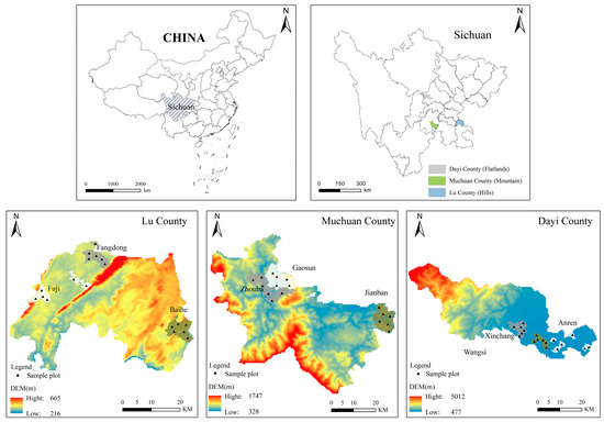 The data used in this study mainly came from a questionnaire survey of farmers in Dayi County, Lu County, and Muchuan County, Sichuan Province, conducted by our research group in July 2024 (Figure 1: in the upper right corner, the main terrain of the three counties is shown by legend, and in the lower image, the difference in elevation within each county is shown by the depth of color). The contents of the questionnaire mainly include family structure, land use, family labor return, agricultural production, and so on. The survey determines samples by combining stratified equal probability sampling with random sampling. The specific sampling steps are as follows: the first step is to divide 151 counties in Sichuan Province except plateau terrain into three groups based on the level of economic development and topography, and a county is randomly selected from the three groups to obtain plain County Dayi County with a high economic development level, Lu County with a moderate economic development level, and Lu County with a low economic development level. In the second step, the villages and towns of the selected sample counties are divided into three groups according to the level of agricultural economic development, one town is randomly selected from each group, and nine sample towns are finally determined. The third step, using the method of random sampling, consists in randomly selecting 6 administrative villages in each sample township, and identifying 54 sample villages; Finally, 20–25 farmers are randomly selected by using the village roster and random number table. Through the above process, and finally, according to the recycling situation and questionnaire data cleaning, 1167 sample farmer observations were obtained.